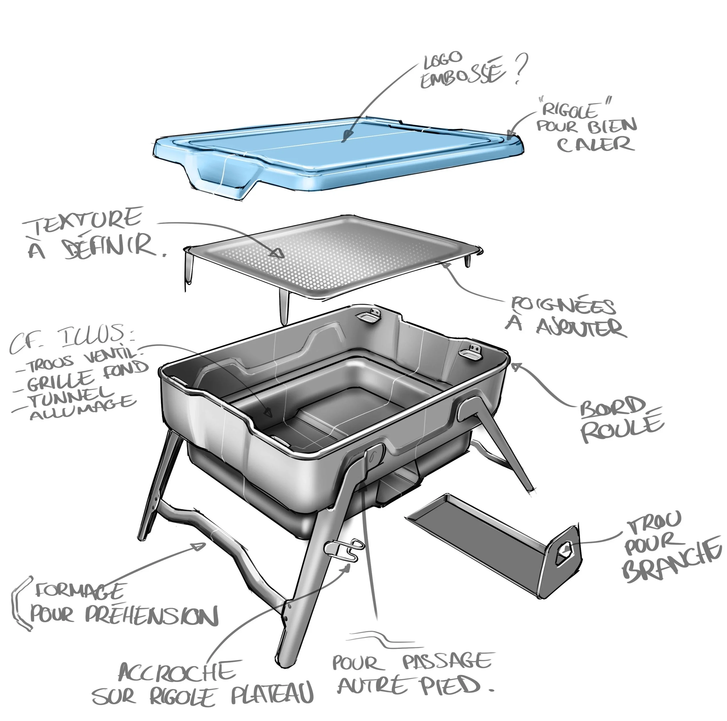 Après évaluation de produits existants, nous avons repensé des solutions simples pour chaque étape d’un barbecue: montage et mise en place; gestion des braises et cuisson; rangement et nettoyage.